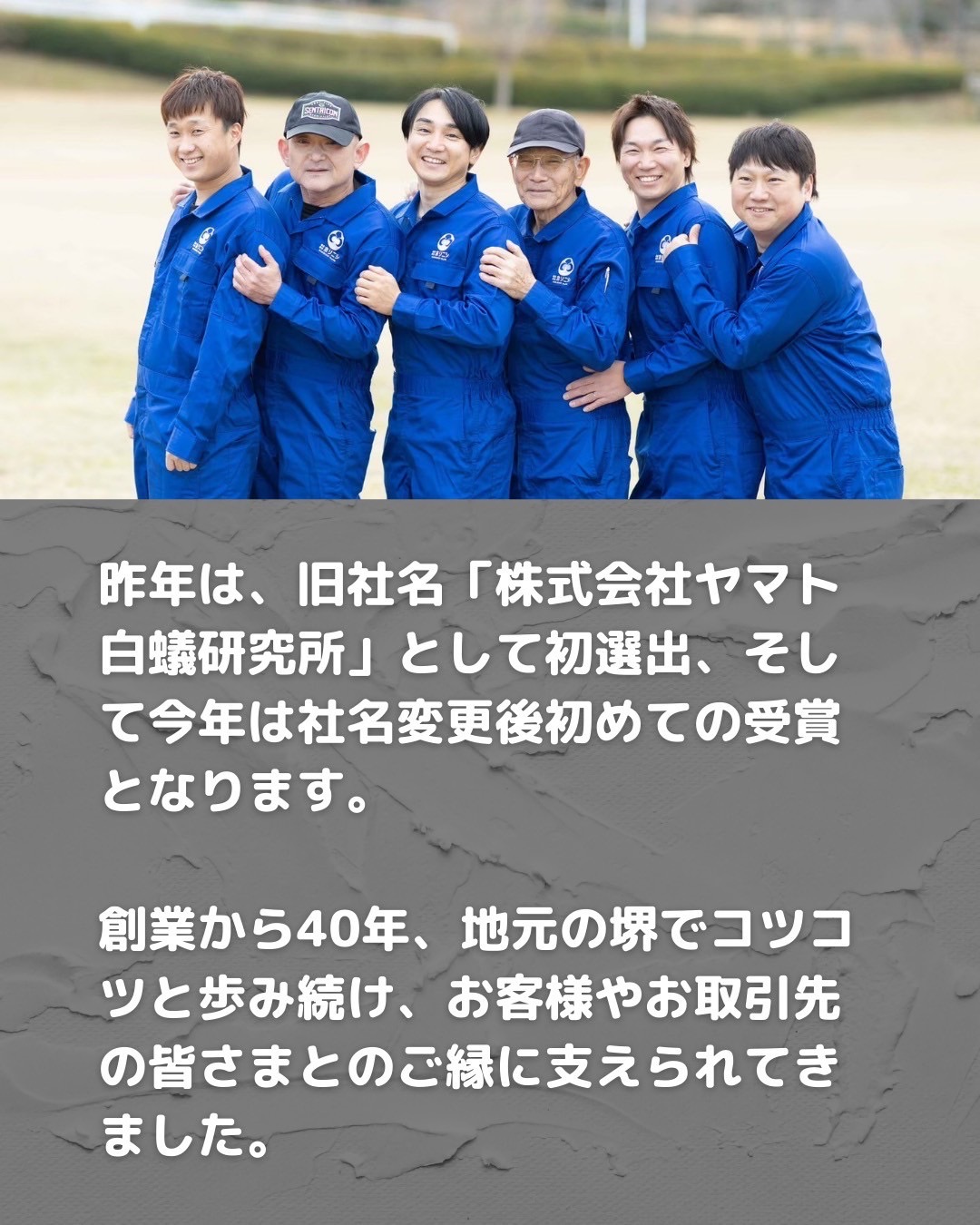 昨年は、旧社名「株式会社ヤマト白蟻研究所」として初選出、そして今年は社名変更後初めての受賞となります。