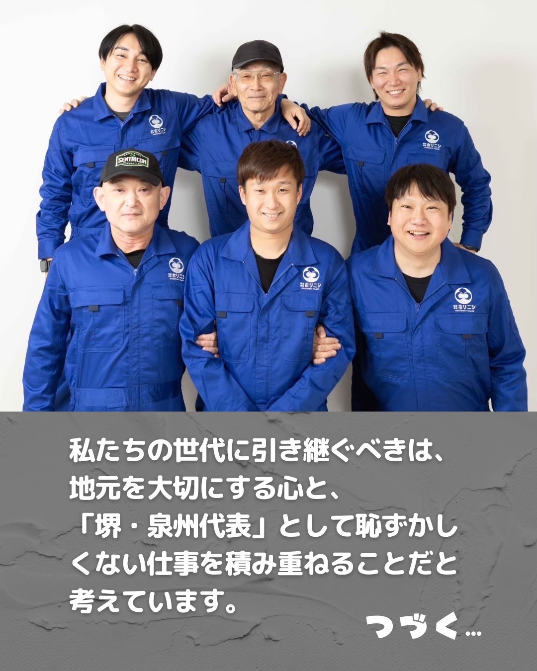 私たちの世代に引き継ぐべきは、地元を大切にする心と、「堺・泉州代表」として恥ずかしくない仕事を積み重ねることだと考えています。