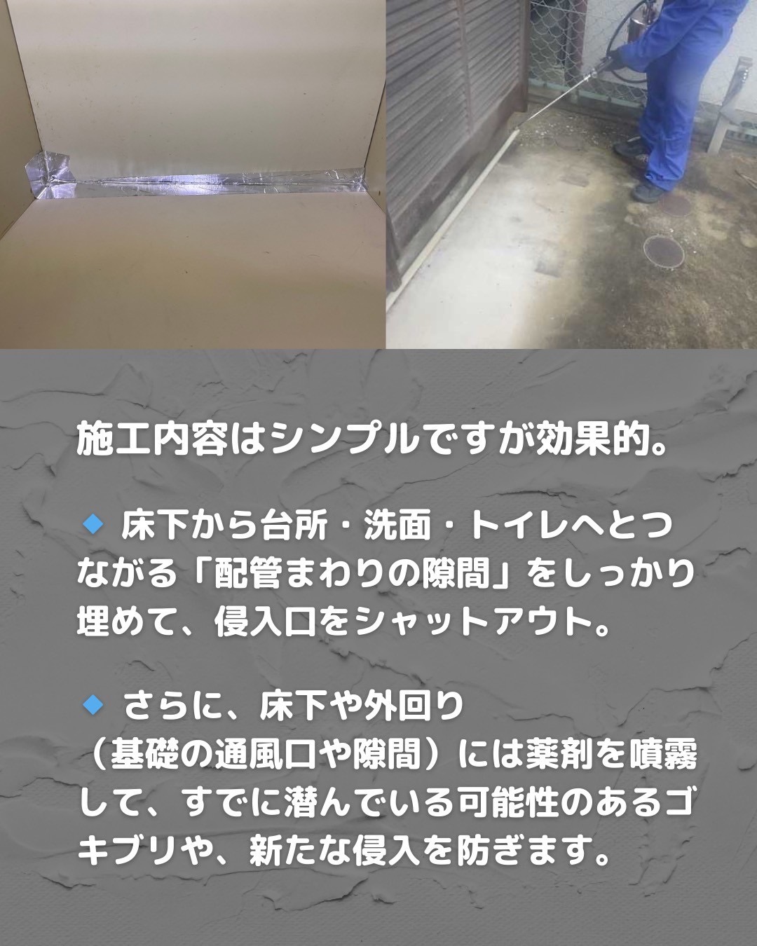 ⚪︎さらに、床下や外回り(基礎の通風口や隙間)には薬剤を噴霧して、すでに潜んでいる可能性のあるゴキブリや、新たな侵入を防ぎます。