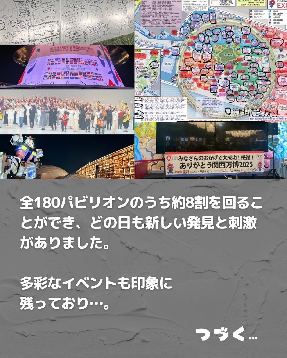 全180パビリオンのうち約8割を回ることができ、どの日も新しい発見と刺激がありました。