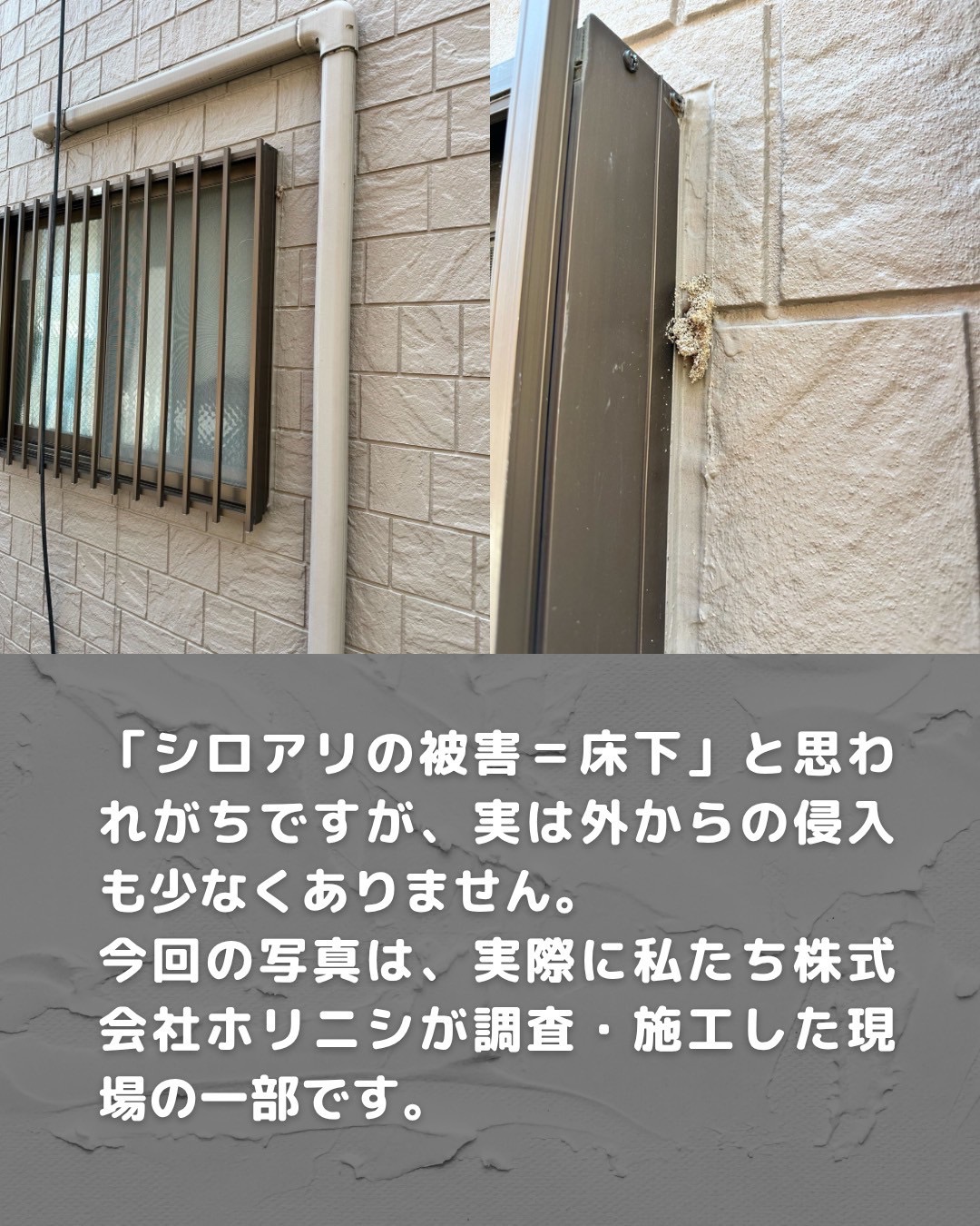 「シロアリは床下だけじゃない。外からも忍び寄っています。」 「シロアリの被害=床下」と思われがちですが、実は外からの侵入も少なくありません。 今回の写真は、実際に私たち株式会社ホリニシが調査・施工した現場の一部です。 ・外壁のコーキング(シーリング)の中に盛り上がるように作られた蟻道 ・建物外基礎の角に蟻道を作り、基礎パッキンの隙間から土台まで到達したケース ・なんと、2階のベランダまで蟻道が上り、外壁のシーリング材の中を通っていたケース ・室内では、木製サッシの上部から蟻道が伸びていた例もあります。 このような土の道を見ても、一般の方は多くの場合「汚れ」や「コーキングの浮き」と思い、シロアリの仕業だと気づきません。 しかし、これらはすべてシロアリが地中と建物をつなぐ生命線(蟻道)です。 こうした外部の小さな変化に早く気づくことが、被害を最小限に抑える第一歩になります。 もし、お住まいの外壁や基礎部分に「筋のような盛り上がり」や「土っぽい線」を見つけたら、ぜひ一度ご相談ください。 株式会社ホリニシでは、 人と自然が共に生きるために、見えない脅威を可視化し、安心を届けたいという想いもあり、建物の外からも床下からも徹底的に点検を行っています。 皆さんの「気づき」が、住まいを守る最初の防波堤になります。 日常の中で「何かおかしいな」と感じたとき、それが大切なサインかもしれません。 執筆者 しろあり防除施工士、蟻害腐朽検査士 株式会社 ホリニシ 代表取締役 堀西 正一郎