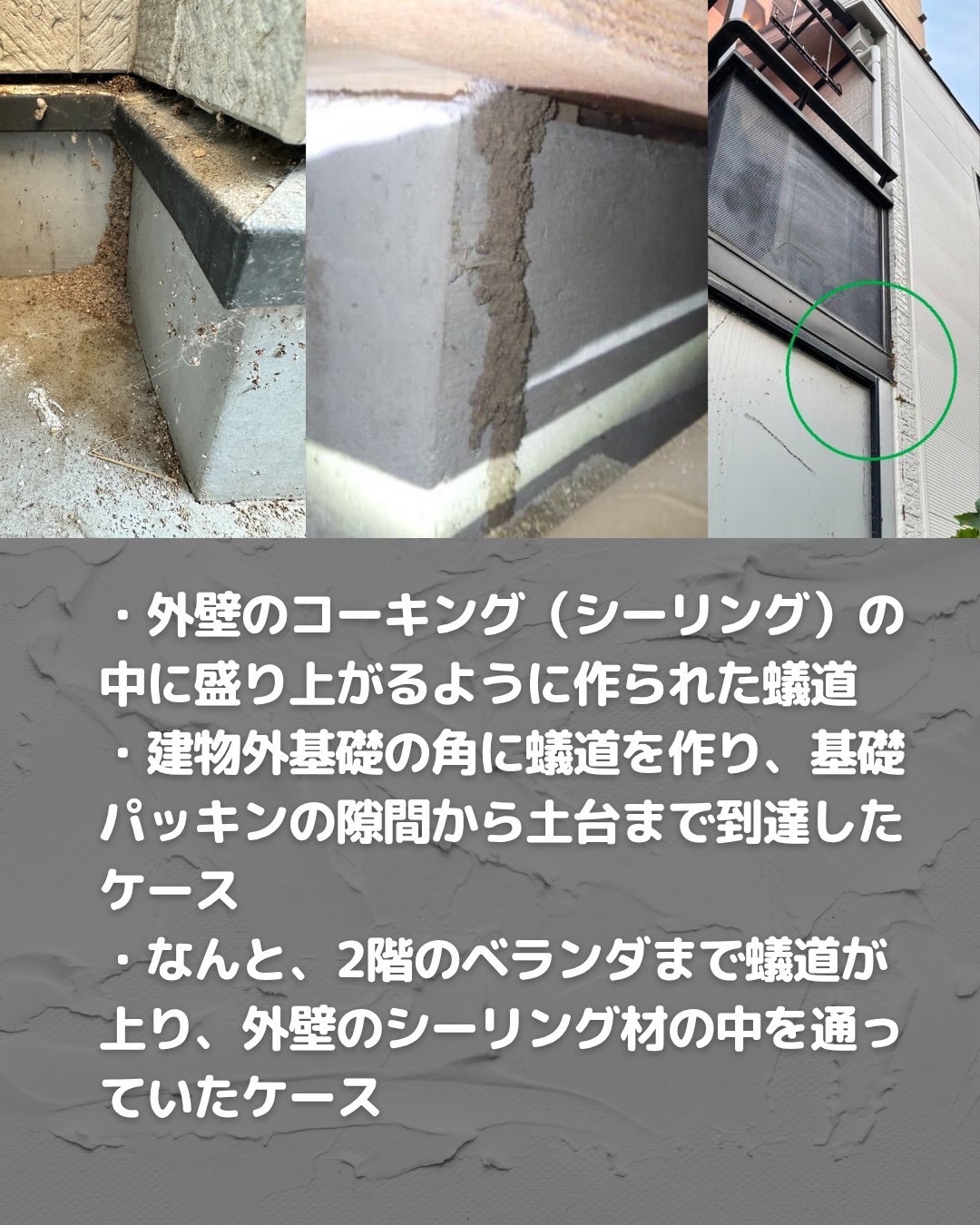 このような土の道を見ても、一般の方は多くの場合「汚れ」や「コーキングの浮き」と思い、シロアリの仕業だと気づきません。