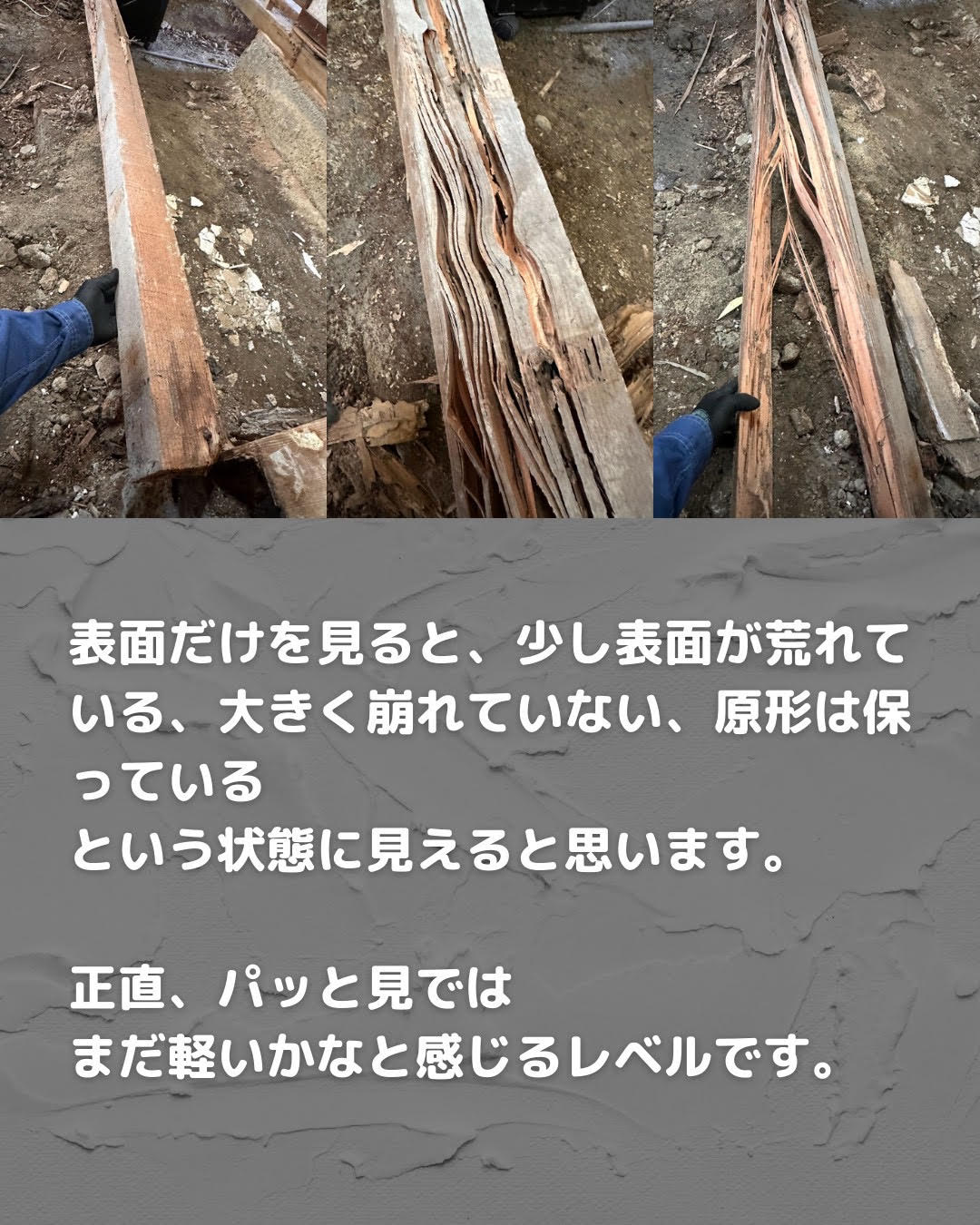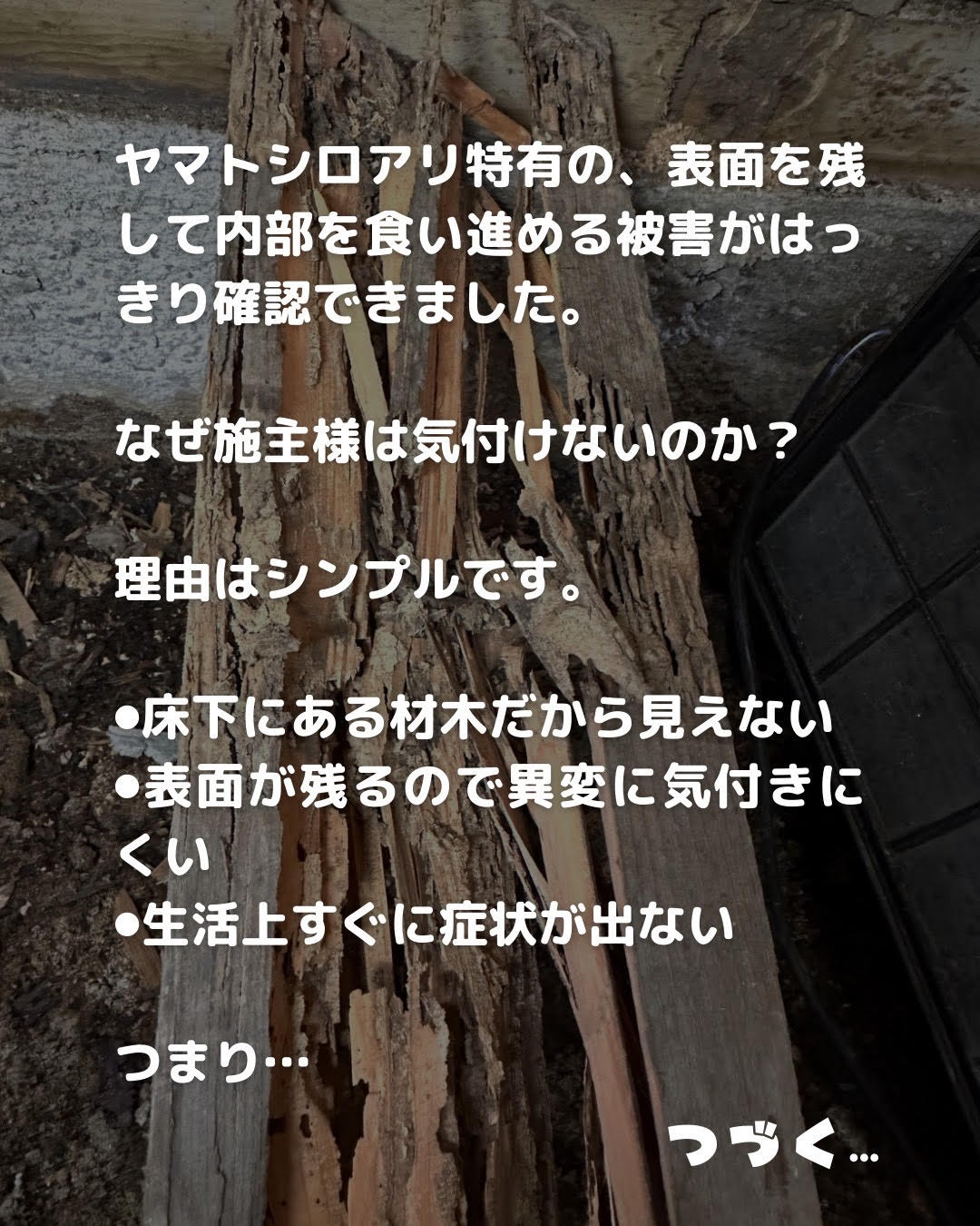 表面だけを見ると、少し表面が荒れている、大きく崩れていない、原形は保っている という状態に見えると思います。 正直、パッと見では まだ軽いかなと感じるレベルです。 しかし、少し崩すと…中身はスカスカ 実際に土台を手で割ってみると、 👉 内部は層状に食害 👉 強度はほぼ残っていない 👉 いわゆるミルフィーユ状態 ヤマトシロアリ特有の、表面を残して内部を食い進める被害がはっきり確認できました。 なぜ施主様は気付けないのか? 理由はシンプルです。 ⚫︎床下にある材木だから見えない ⚫︎表面が残るので異変に気付きにくい ⚫︎生活上すぐに症状が出ない つまり、気付いた時には強度が落ちている、というケースが非常に多いのです。 「ヤマトだからまだマシ」 とよく言われますが、危険な認識です⚠️ 「イエシロアリよりヤマトは被害が軽いですよね?」 確かに進行速度は違います。 しかし今回のように、 ヤマトシロアリでも土台内部をここまで食べるのが現実です。 種類がヤマトだから安心!ではありません。 株式会社ホリニシでは常にお伝えしています。 シロアリ対策は、被害が出てからではなく、出る前に。 見えない床下で、 静かに、確実に進行するのがシロアリ被害です。 だからこそ、定期点検し早期発見、適切なシロアリ対策施工 が住まいを守る鍵になります。 今回のように、見た目は軽そうでも中身は深刻というケースは決して珍しくありません。 「うちは大丈夫かな?」と少しでも感じた方は、早めの点検をおすすめします。 株式会社ホリニシは、 これからも人間とシロアリの共存を考えながら、大切なお住まいを守るお手伝いを続けてまいります。 執筆者 しろあり防除施工士、蟻害腐朽検査士 株式会社 ホリニシ 代表取締役 堀西 正一郎